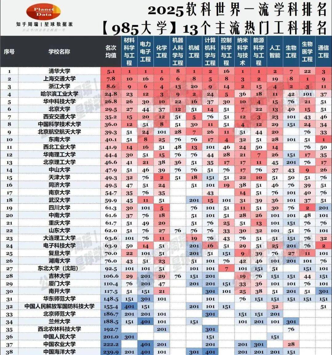 榜单由互联网博从“知乎周瑞”拾掇并发布,取的是各985大学13个支流抢手工科专业名次的均值。