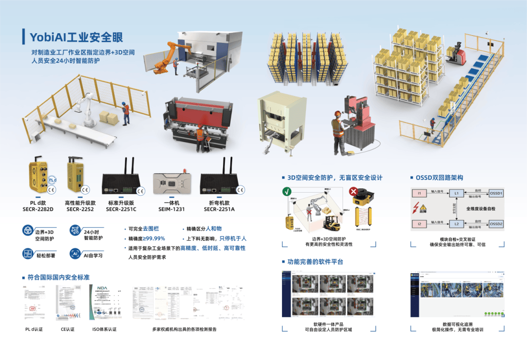 就如许,正在一次次手艺攻坚和客户反馈的打磨中,YobiAI工业平安眼从最后的概念原型,慢慢变成了国表里首个AI平安视觉标品,现已笼盖工业六轴机械人、协做机械人、折弯机、桁架、冲压机床、智能仓库、激光切割机、压铆机、铆合机、天车等多个功课区,成了守护工人平安的“标配”。