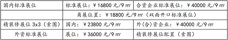 1、尺度展位9m²(3m×3m);设置装备摆设:展出场地、三面展板(高2。5m)、一块中英文楣板 、一 张洽商桌、二把椅子、地毯、220V电源插座一个、二支射灯。